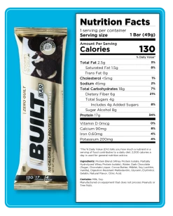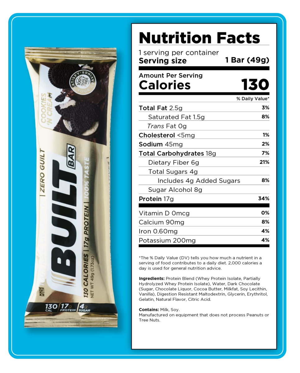 The classic flavor combination of Cookies ‘N Cream comes to life in this latest creation from Built Bar. Covered in 100% dark chocolate, one bite in, you will forget you are eating a healthy protein bar. You’re welcome.