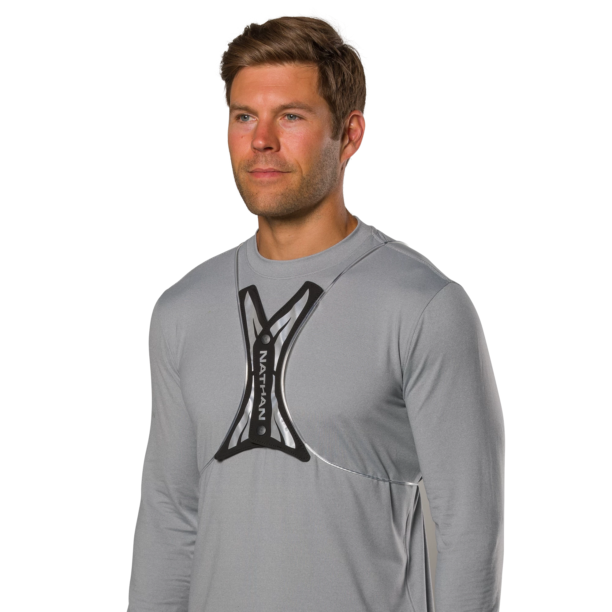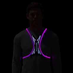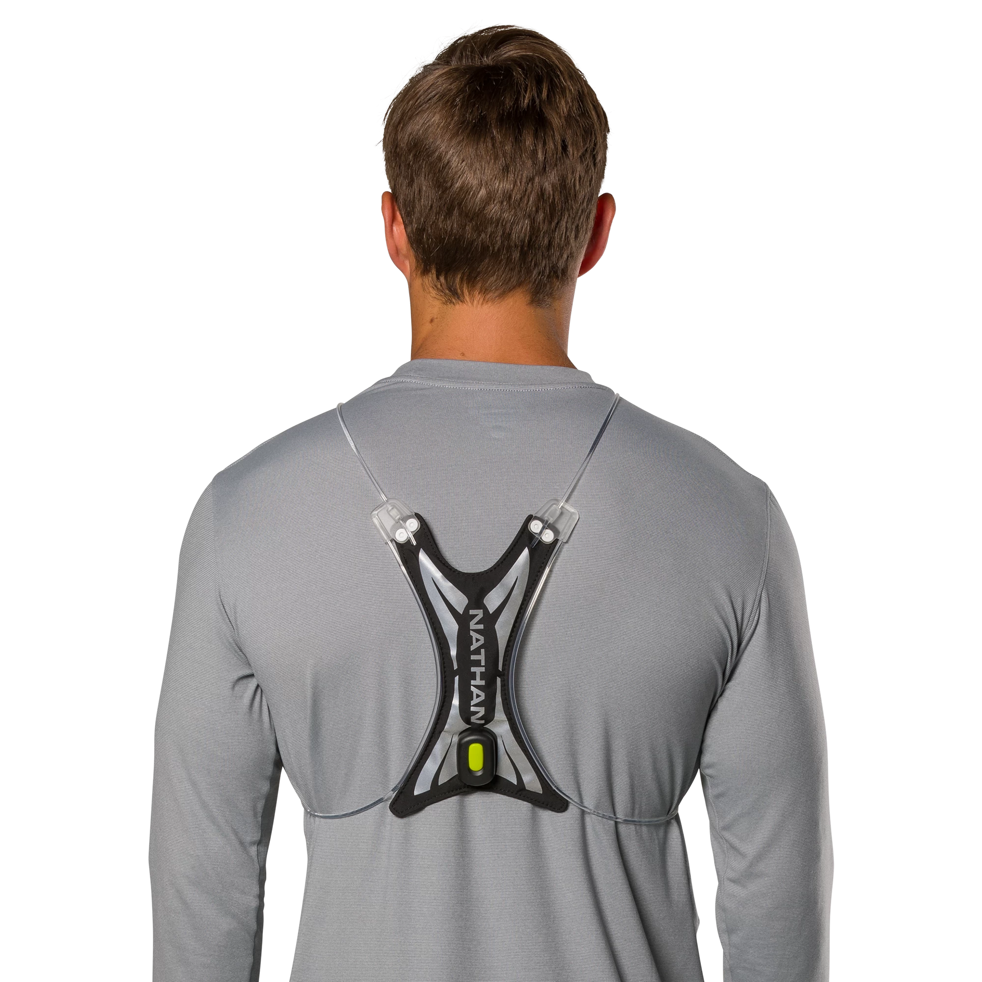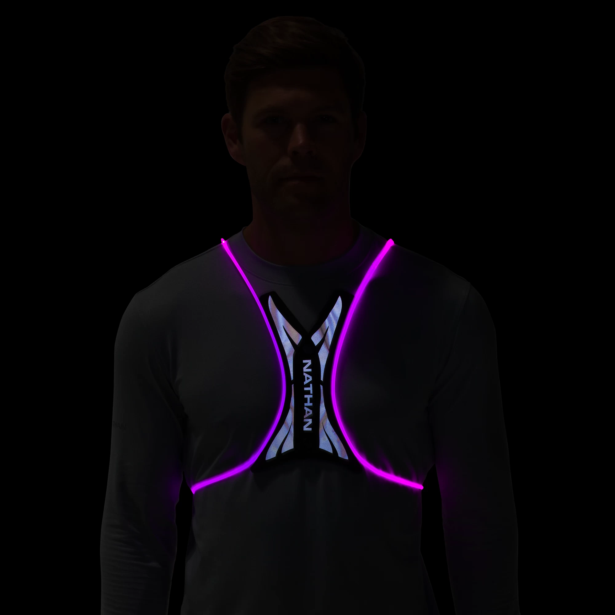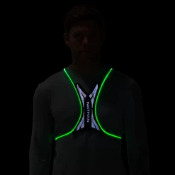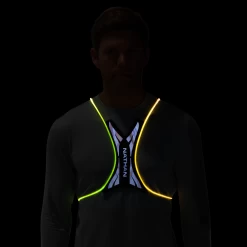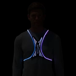 The Nathan Hypernight Laser Light Vest features a 10 lumen fiber optic light tube with eight different settings: red, green, blue, teal, yellow, white, pink, or multi-color strobe. It provides 360º visibility from 1200 yards away.