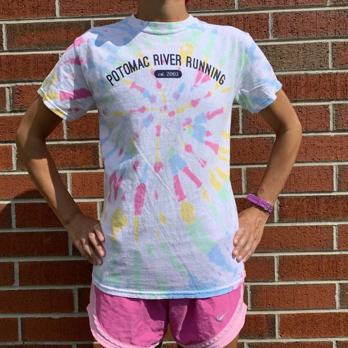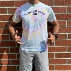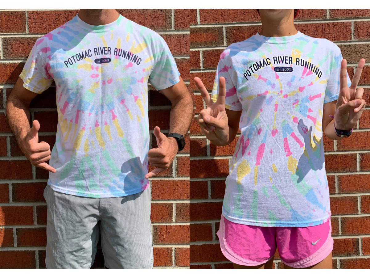 Super fun cotton tie dye tee screen printed with a Potomac River Running graphic. Perfect for when you’re not on the run, just running around.