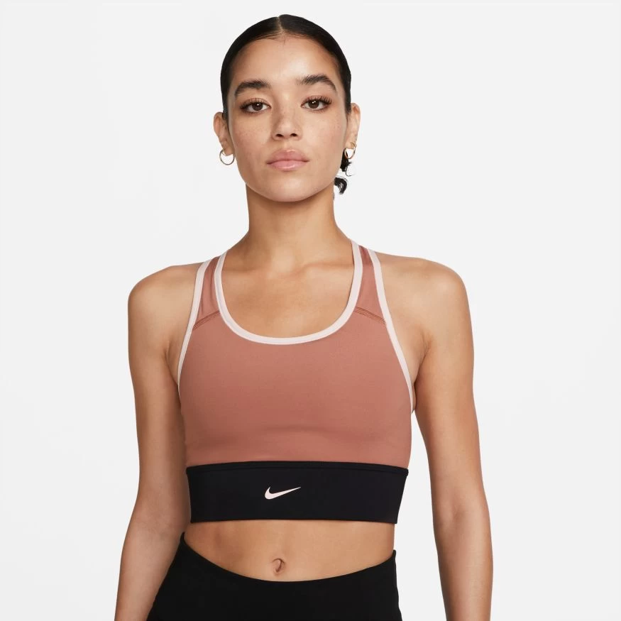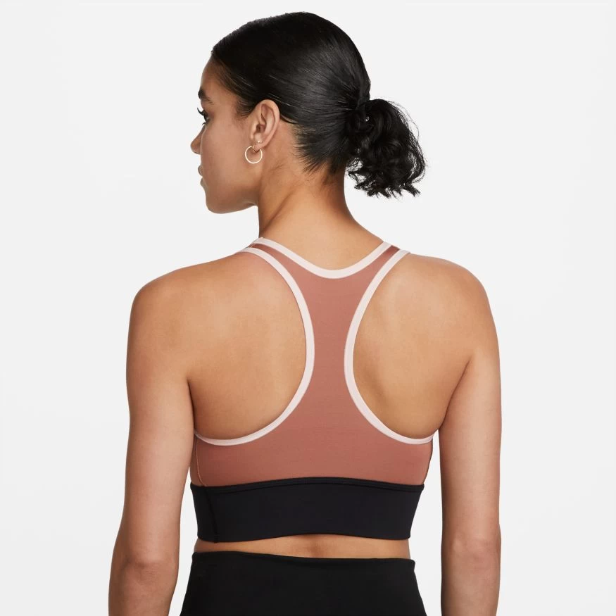 The Nike Dri-FIT Swoosh Sports Bra gives you more coverage with a length that extends just below your rib cage, and the flexibility of a racerback design. The stretchy material moves with you whether you’re throwing weights or tracking miles on the elliptical. A tight fit gives you medium support and a removable 1-piece pad adds extra coverage when you need it. This product is made with at least 50% recycled polyester fibers.