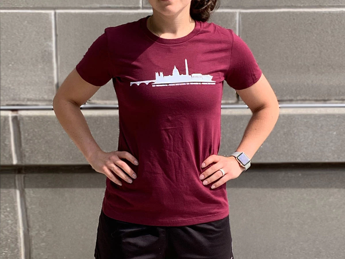 Super soft cotton tee screen printed with a skyline graphic and Potomac River Running branding. Perfect for when you’re not on the run, just running around.
