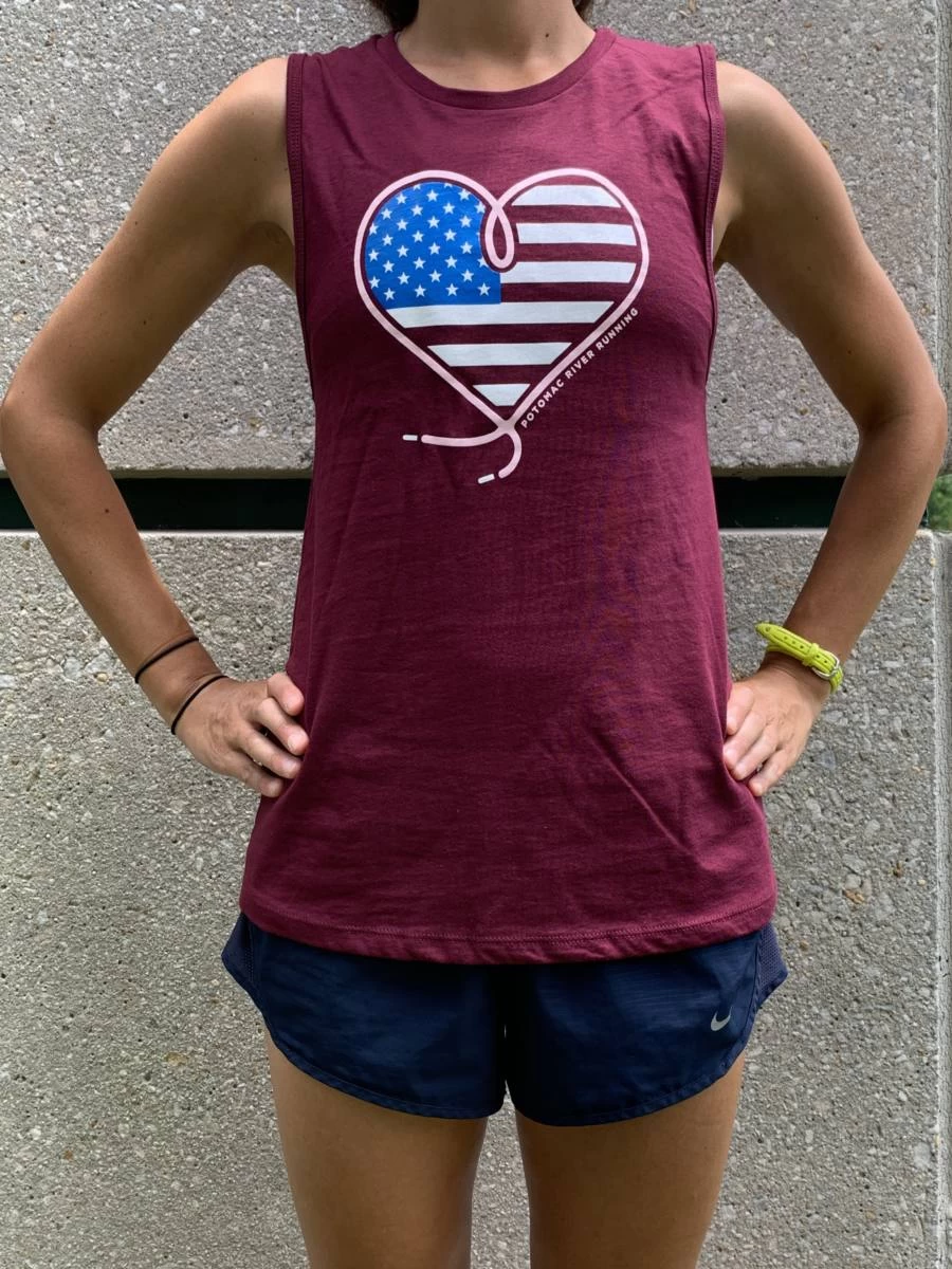 Super soft cotton tank screen printed with a patriotic heart graphic and Potomac River Running branding. Perfect for when you’re not on the run, just running around.